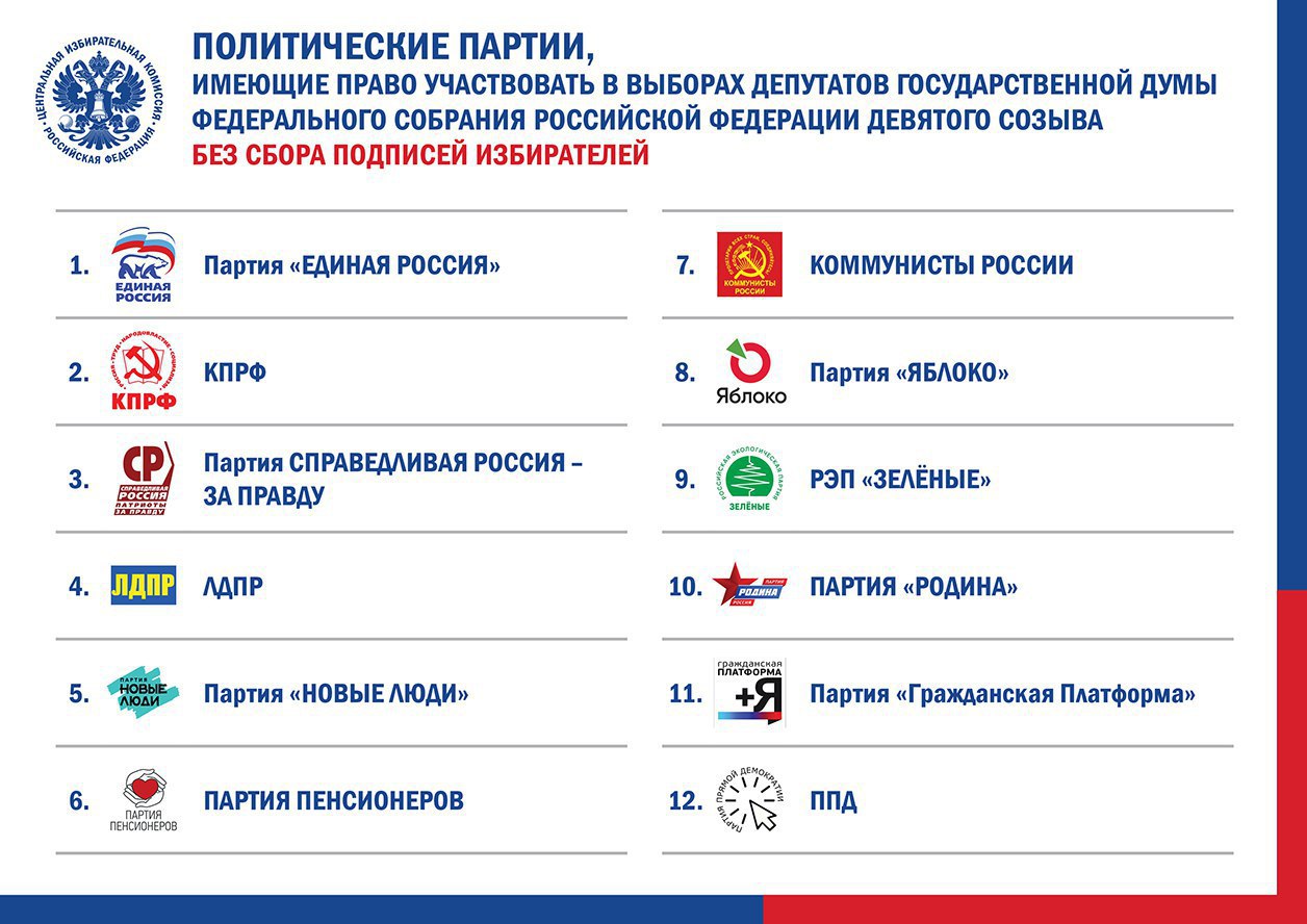 12 партий смогут участвовать в выборах в Госдуму девятого созыва без сбора подписей избирателей  в поддержку своего выдвижения.